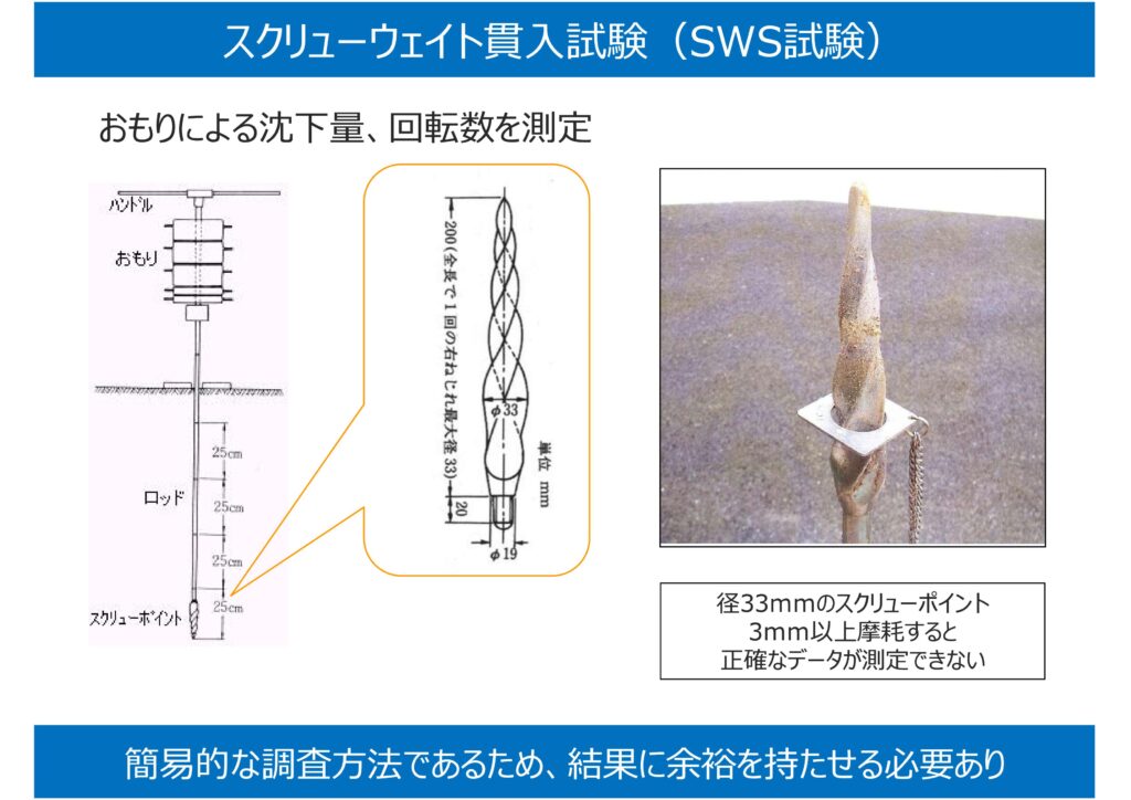 SWS試験(スクリューウェイト貫入試験)は以前はスウェーデン式サウンディング試験と言われていましたが、今では正式名称はスクリューウェイト貫入試験といいます。