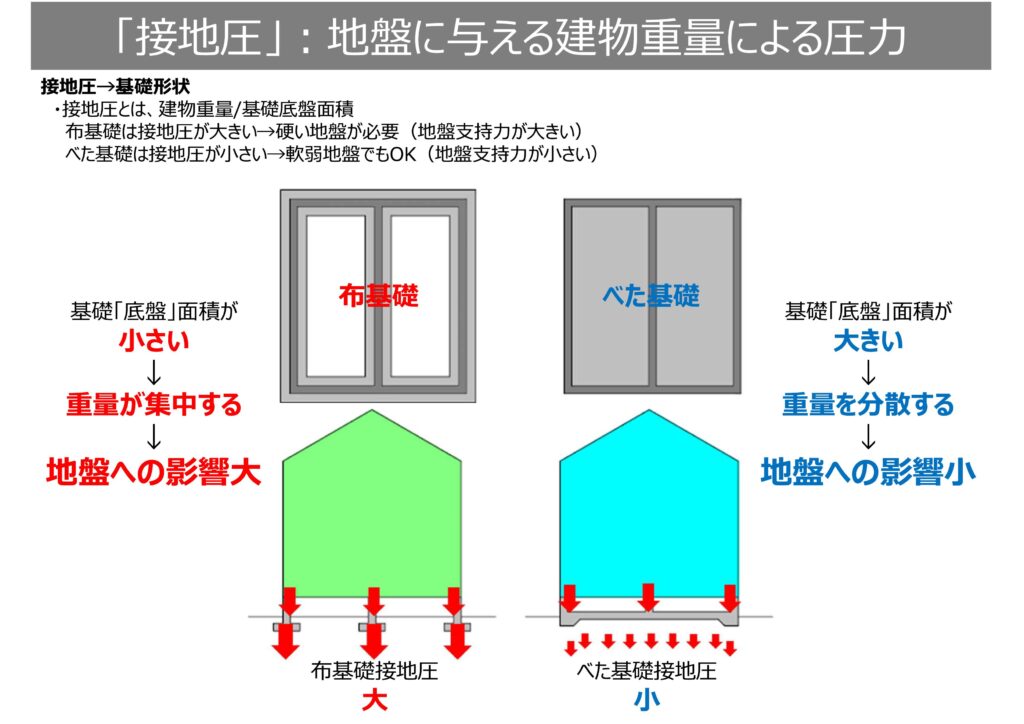 地盤が固い==>「布基礎」、地盤が軟弱==>「べた基礎」、更に軟弱だと地盤補強が必要になります。