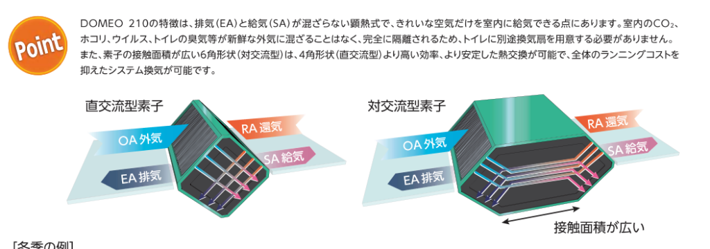 気候が逆のヨーロッパでは顕熱型でも問題ないのですが、日本では全熱交換型の方があっている時期が多いと思います。