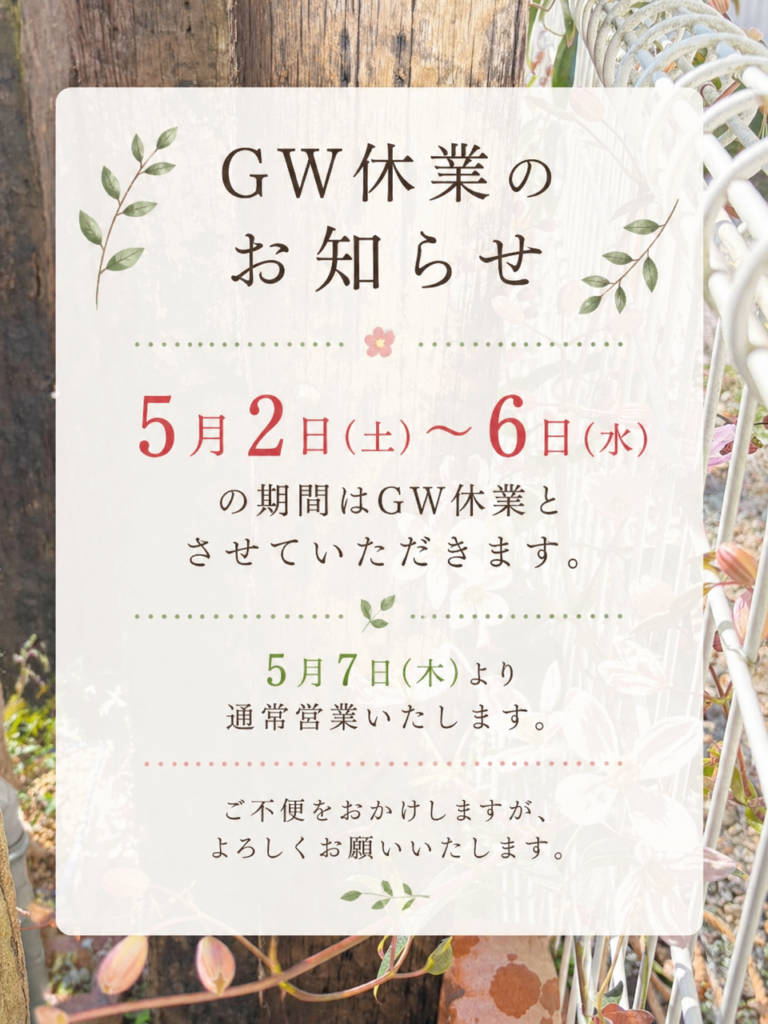 2026.04.27 GW休業のお知らせ 新着情報 いつもありがとうございます。 誠に勝手ながら、5月2日(土)~5月6日(水)の期間は ゴールデンウィーク休業とさせていただきます。 5月7日(木)より通常営業いたします。 休業中にいただいたお問い合わせは、 営業再開後、順次ご対応いたします。 ご不便をおかけしますが、よろしくお願いいたします。 基礎~縦筋のフックは必要?・・・安全な基礎とは 記事一覧へ戻る